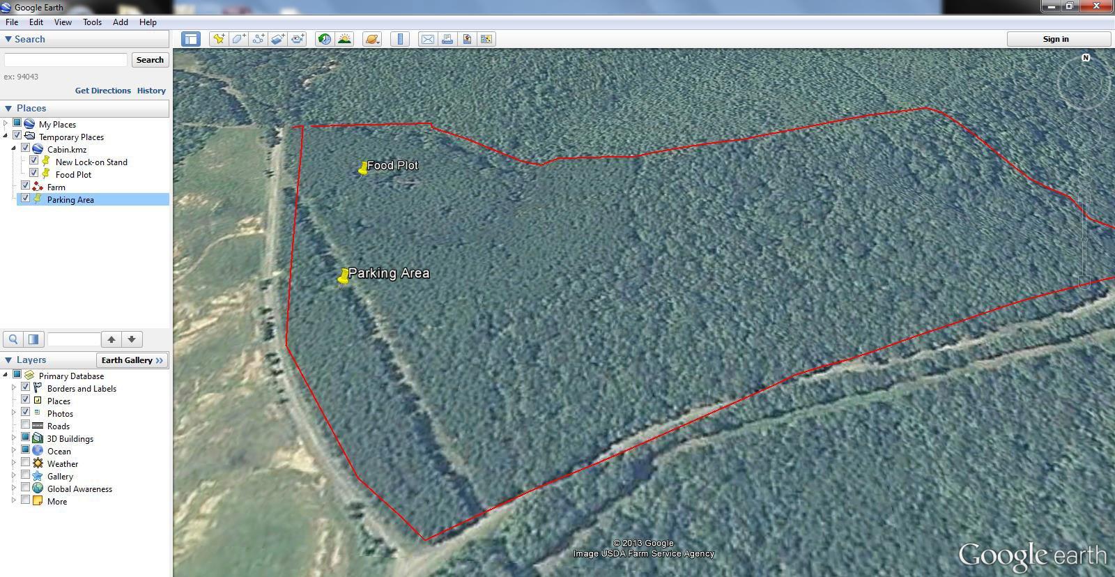 Last fall, I got permission to hunt a new area that I'd never seen before. The landowner told me the parcel's boundaries weren't marked very well. So, using a copy of the county plat map as reference, I used Google Earth to draw the boundary lines. I saved them in the My Places section, exported the file, and then e-mailed it to myself. Upon arriving at the location, I simply downloaded the .KML file from my e-mail, opened it in Google Earth and bingo, I had my own custom boundary map. As I walked around the property, the Google Earth system showed me where I was, and the red boundary lines I had created were clearly visible on the map.