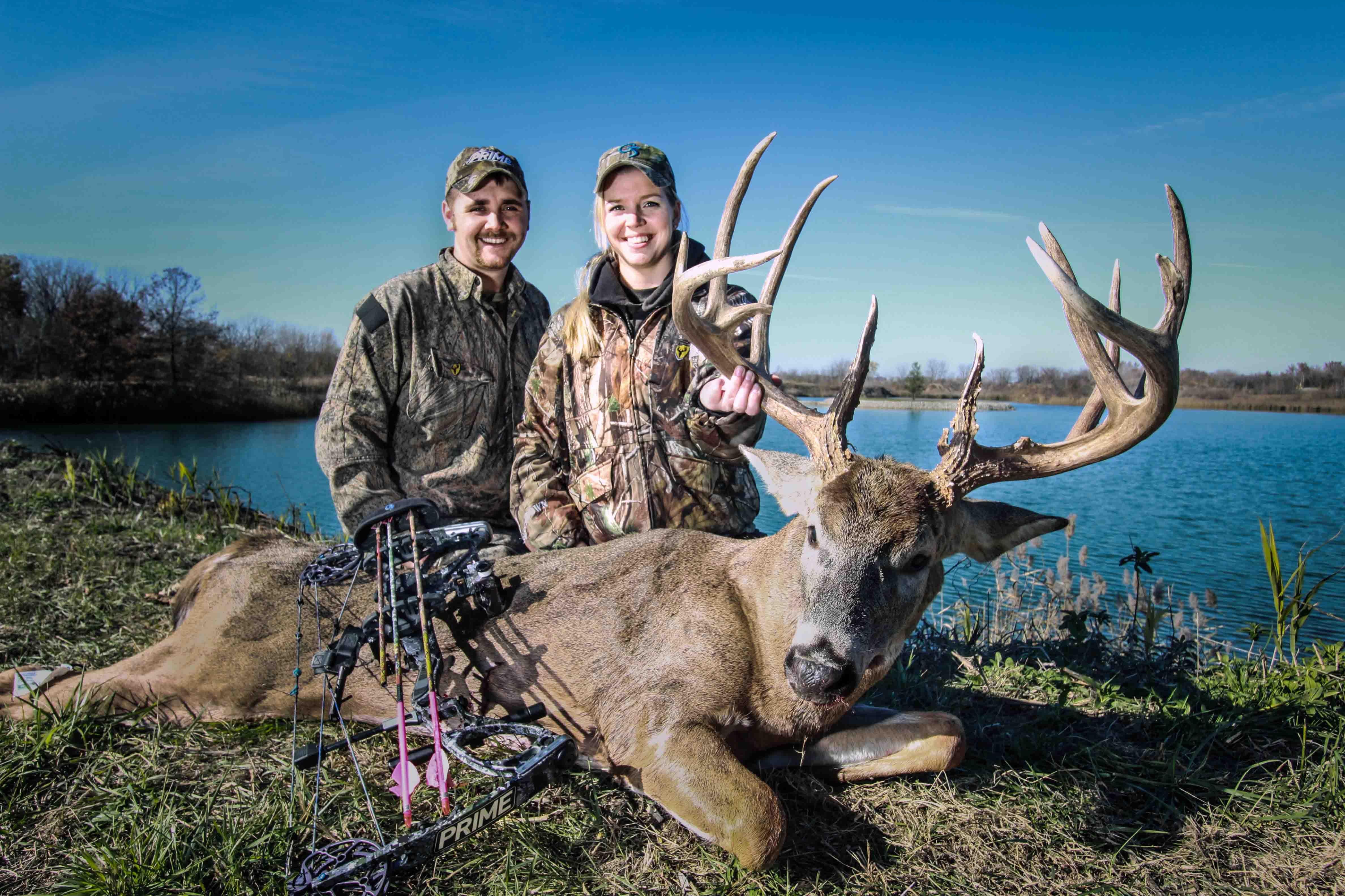 Jennifer held the bow that evening while Kyle filmed. A mature 8-pointer with a doe bedded in front of them. A little later, they saw the giant working his way through the timber at an angle that would keep him out of range. Kyle snort-wheezed, and both bucks collided in a battle that tore up the entire area. Adrenaline raged in both hunters as the bucks battled it out. They didn't know if an ethical shot would present itself. But a yearling buck snuck in and chased the doe right by their stand. That small twist of fate turned the tables. When the fight finally broke up, the 8-pointer left at a dead run, and the big buck began to walk away when it hit the trail of the hot doe, which led him right to the stand. Despite being extremely shook up from all the excitement, Jennifer put the Montec on the money, and the buck fell only 80 yards away.
